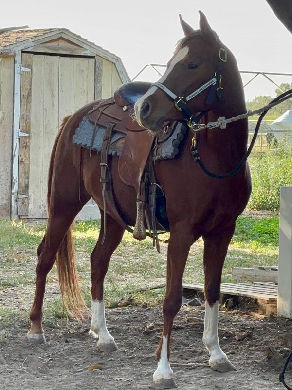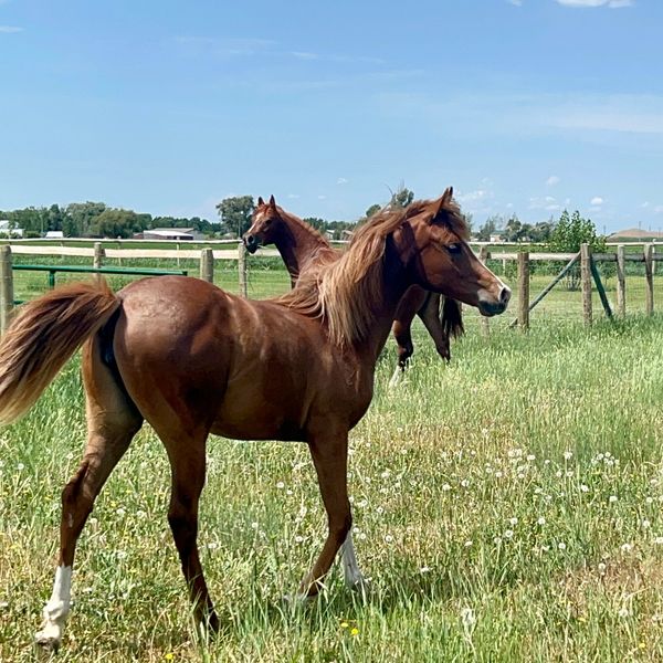 She is also the first filly of our stallion Dream's. She is a 3/4 Arabian 1/4 Quarter Horse. She came out a spitting image of her dam except being chestnut vs red dun like her dam. But very similar markings and exact sassy sweet personality.